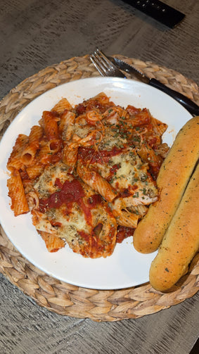 freshly seasoned chicken breast with rotini pasta with maranata sauce garnished with garlic seasoning and mozarella